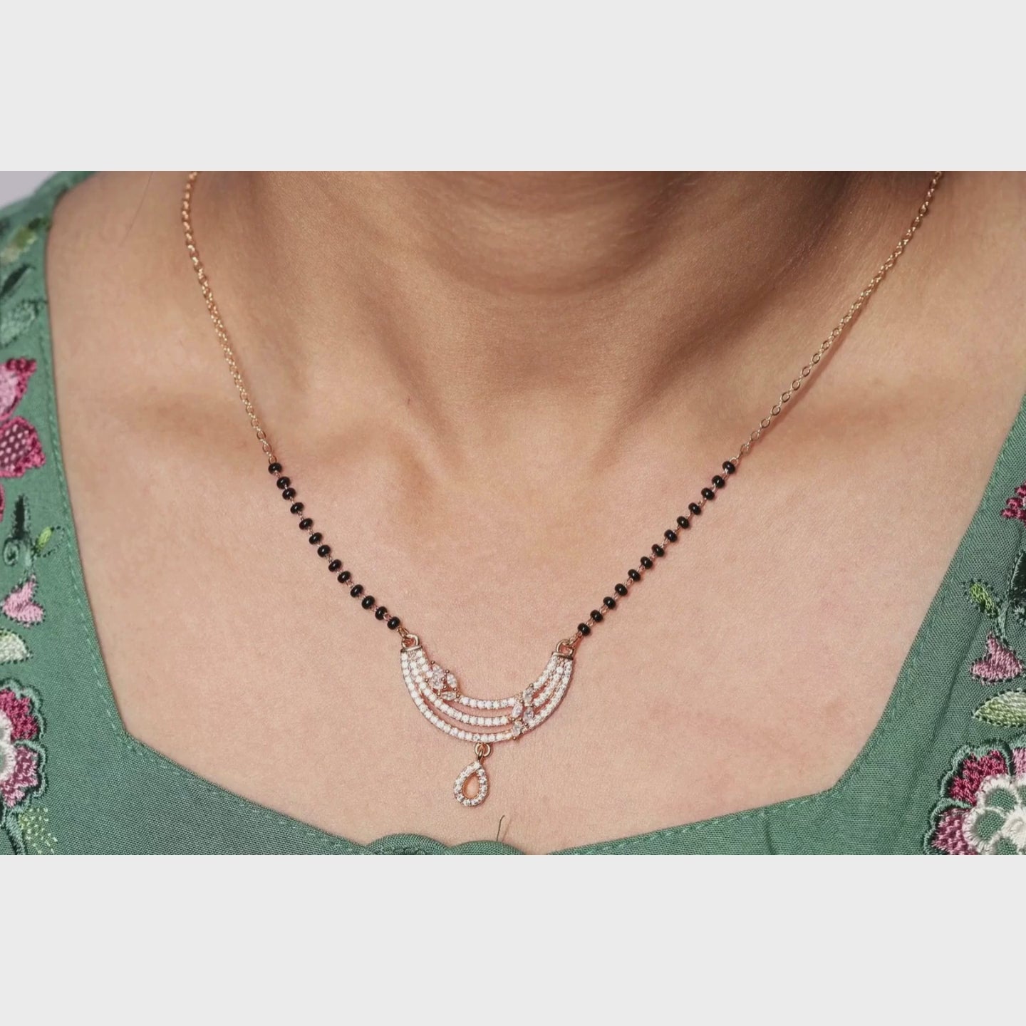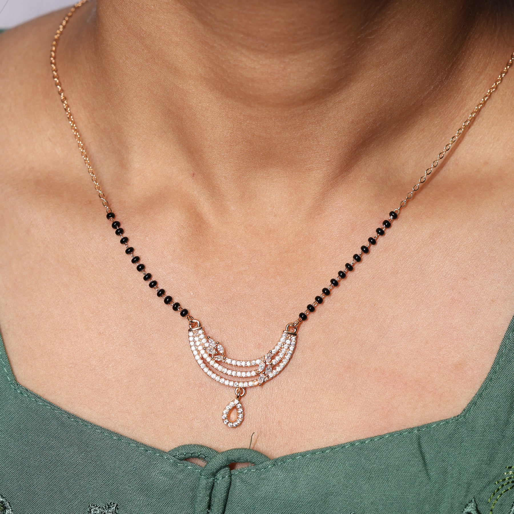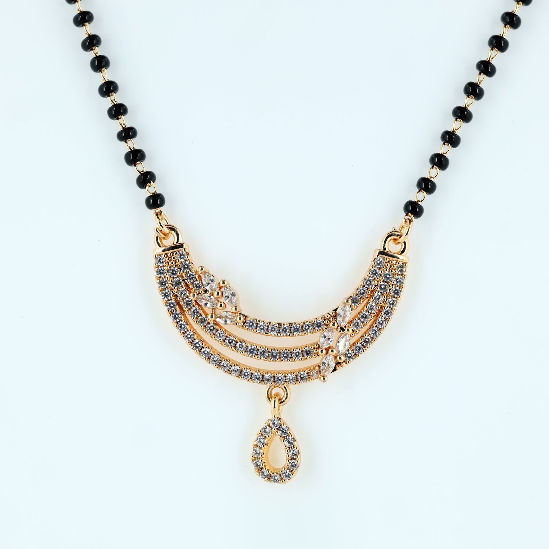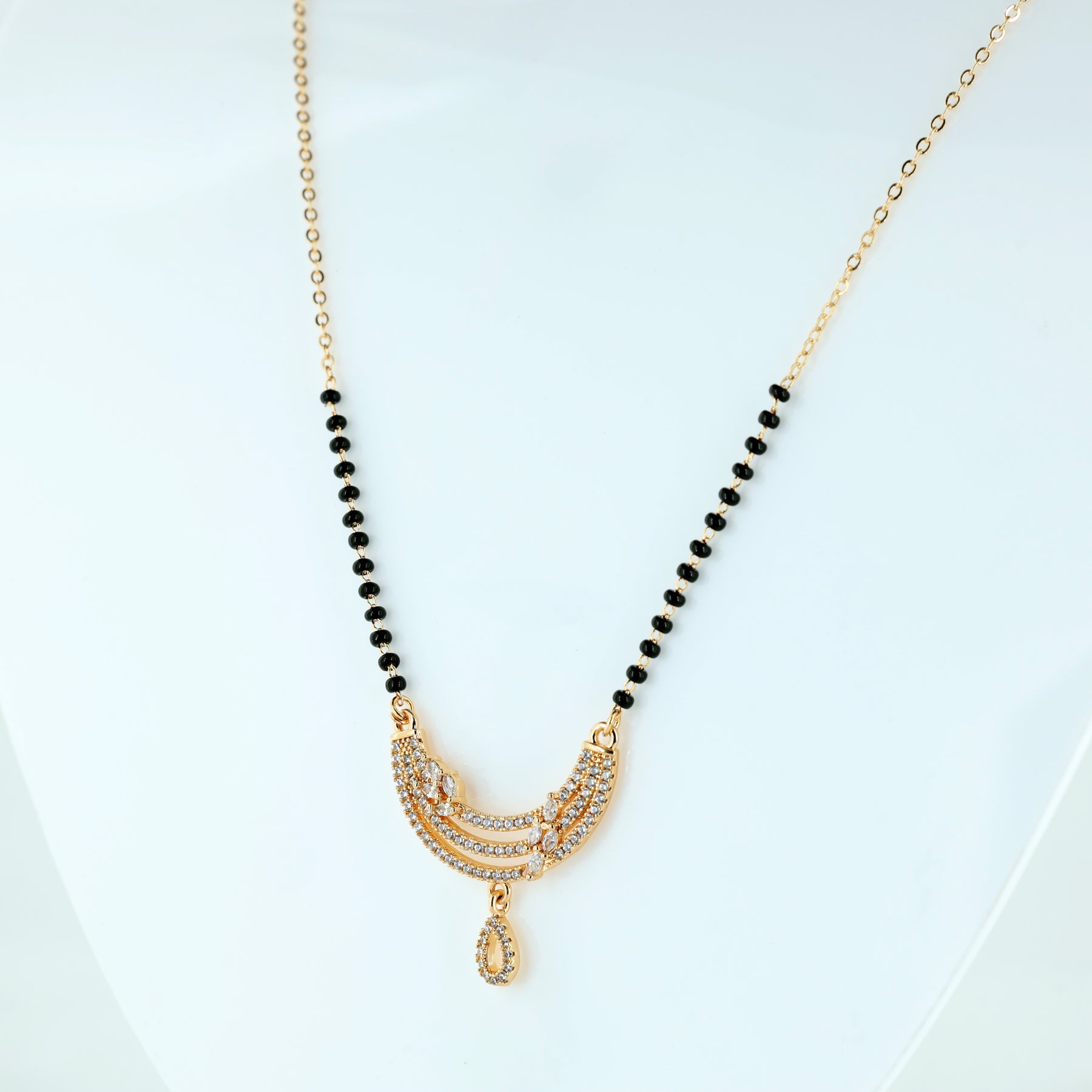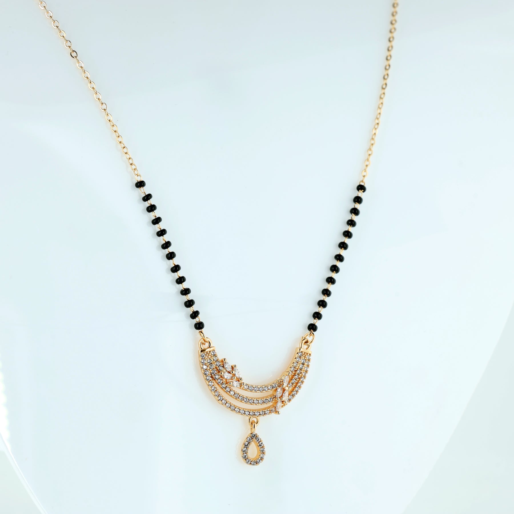 A stunning fusion of heritage and high fashion, featuring a triple-tiered crescent pendant encrusted with shimmering pave crystals. Accented with a dainty, crystal-drop charm and traditional black beads integrated into a polished gold-toned chain.Designed for the modern woman who values tradition but prefers a contemporary, lightweight aesthetic.Sophisticated enough for weddings and festivals, yet sleek enough for professional daily wear.