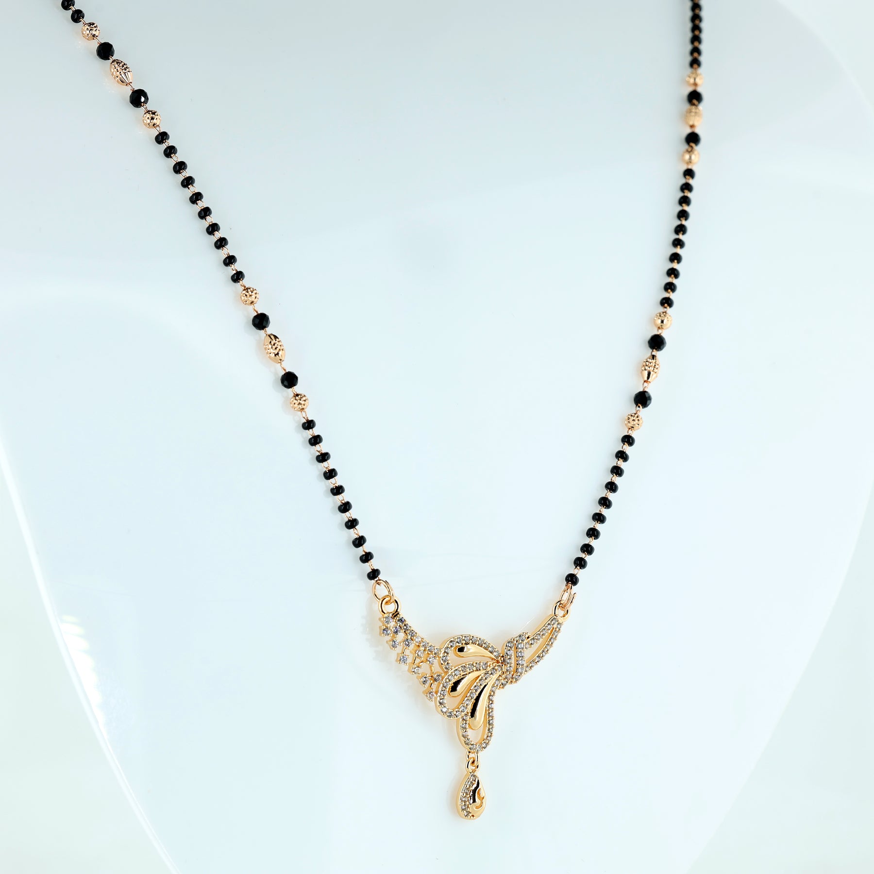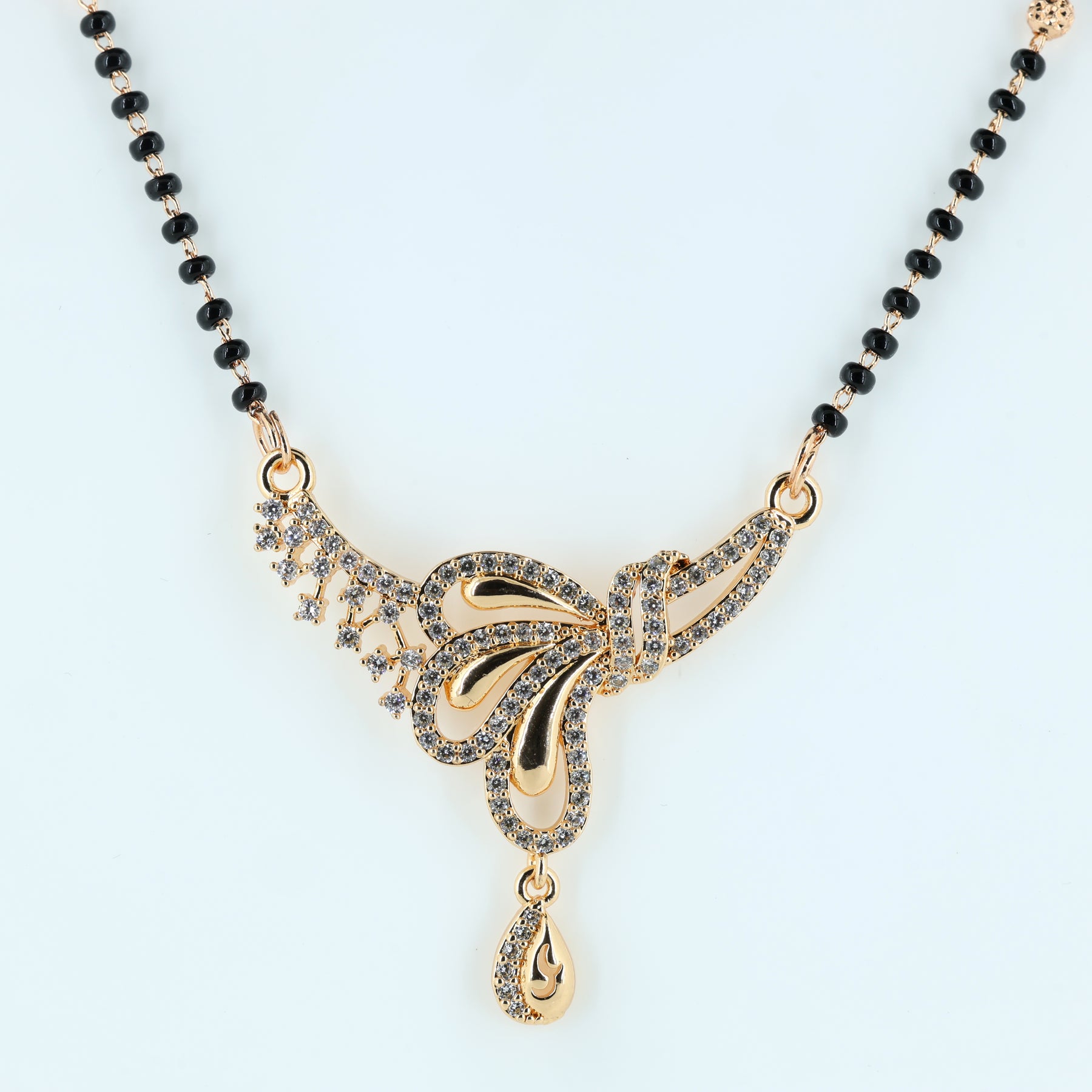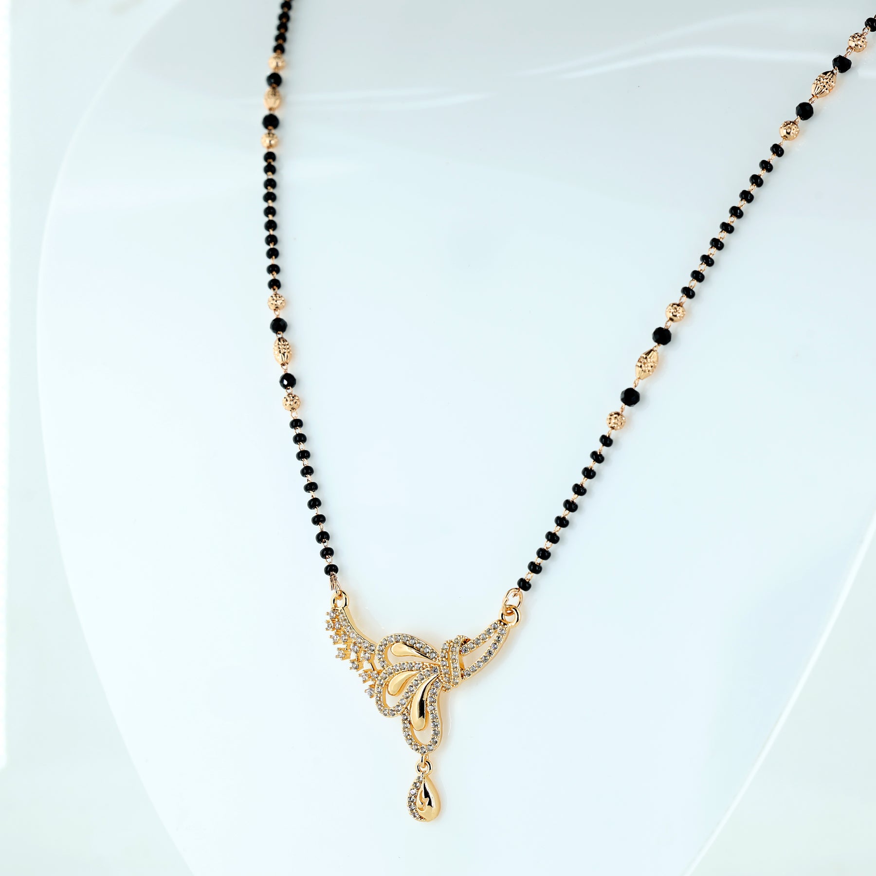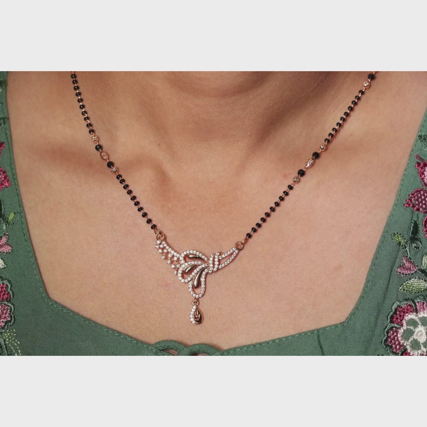 Add a touch of charm and elegance to your jewelry collection with this beautifully crafted butterfly mangalsutra. Featuring a dazzling crystal-studded butterfly pendant with delicate curves and a graceful drop accent, this piece perfectly blends tradition with modern sophistication. The classic black bead chain enhances its timeless appeal, making it ideal for daily wear or festive occasions. Lightweight, stylish, and meaningful, this mangalsutra is designed for women who appreciate refined beauty and contemporary design.
