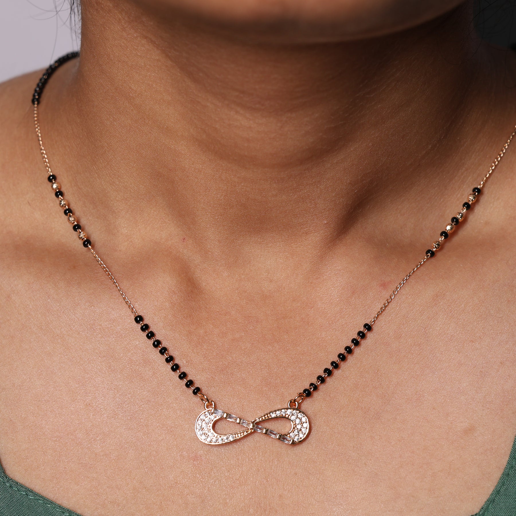 Elevate your everyday style with these contemporary rose gold-toned Mangalsutras. One design features a symbolic infinity pendant, while the other showcases an intricate floral filigree pattern, both accented with shimmering stones for a touch of radiance. These pieces combine traditional black beads with sleek metallic chains, making them perfect for the modern woman who seeks a balance between heritage and minimalist fashion.