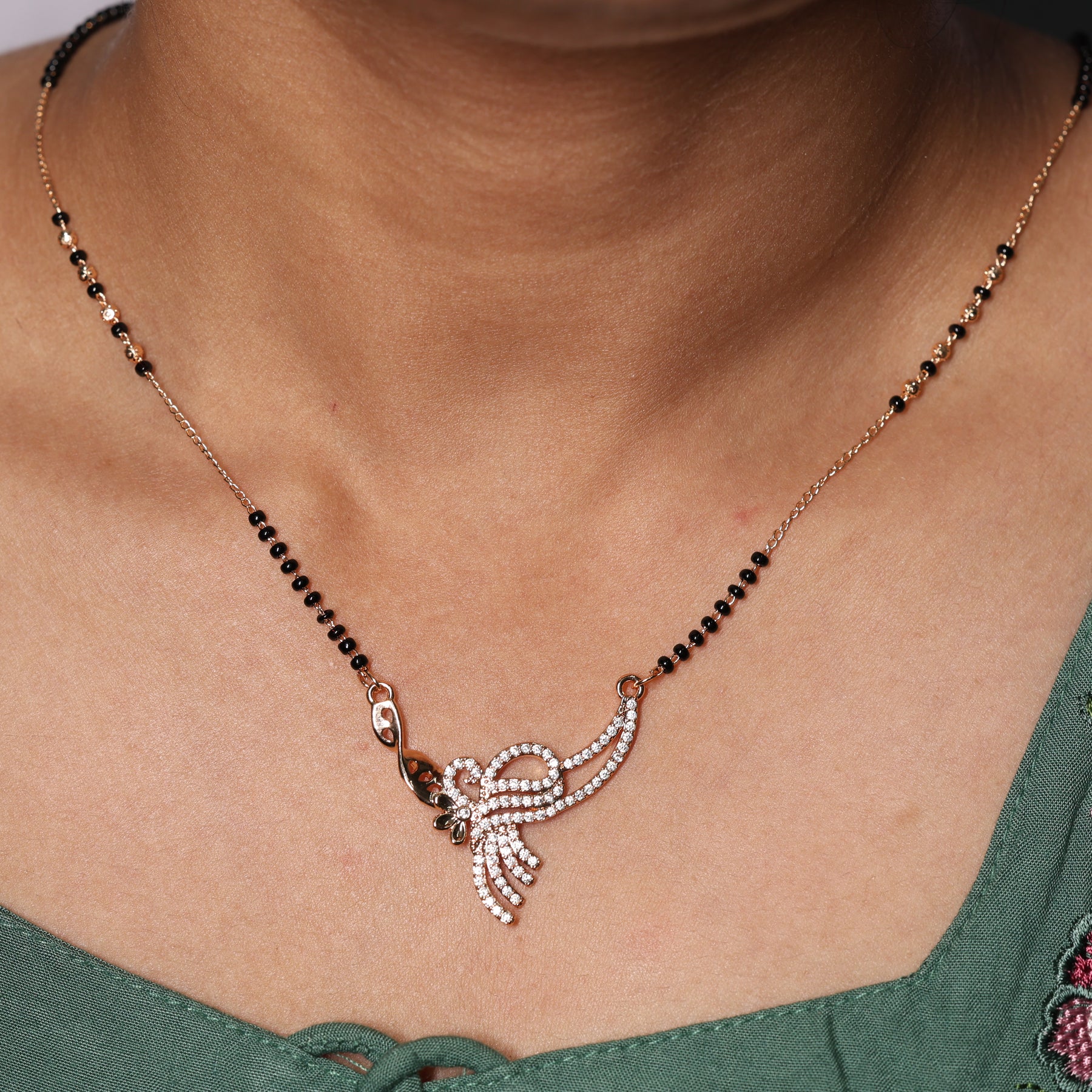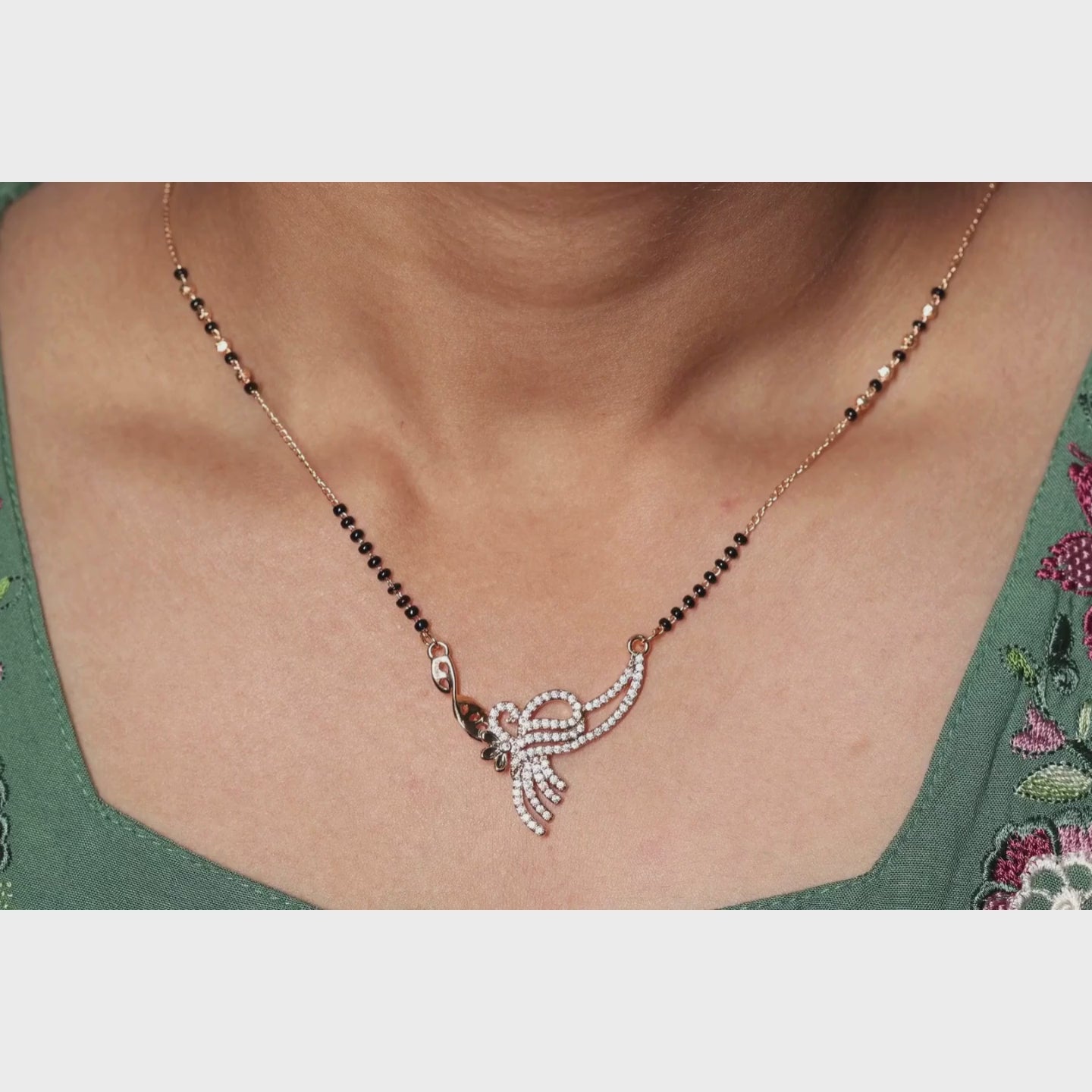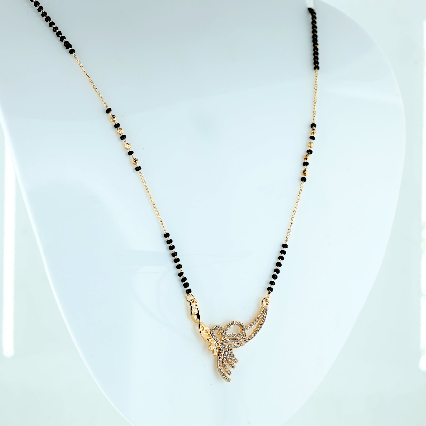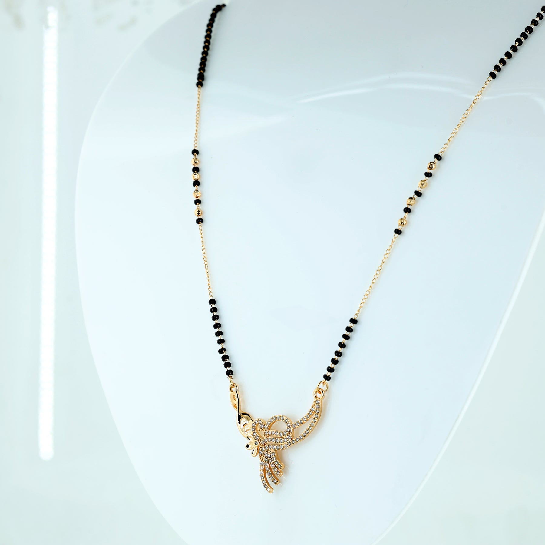 Featuring a creative and artistic silhouette, this Mangalsutra highlights a fluid, floral-inspired motif encrusted with brilliant pave stones. The centerpiece curves into an elegant, asymmetrical sweep that resembles a delicate blossom or stylized plumage. This modern focal point is paired with a classic gold-toned chain featuring alternating black and textured gold beads, making it an ideal choice for those who appreciate unique, contemporary jewelry with a traditional soul.