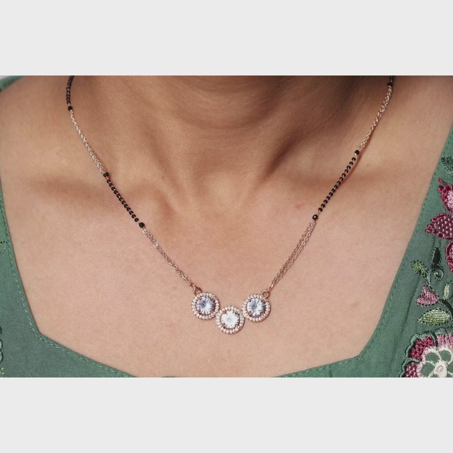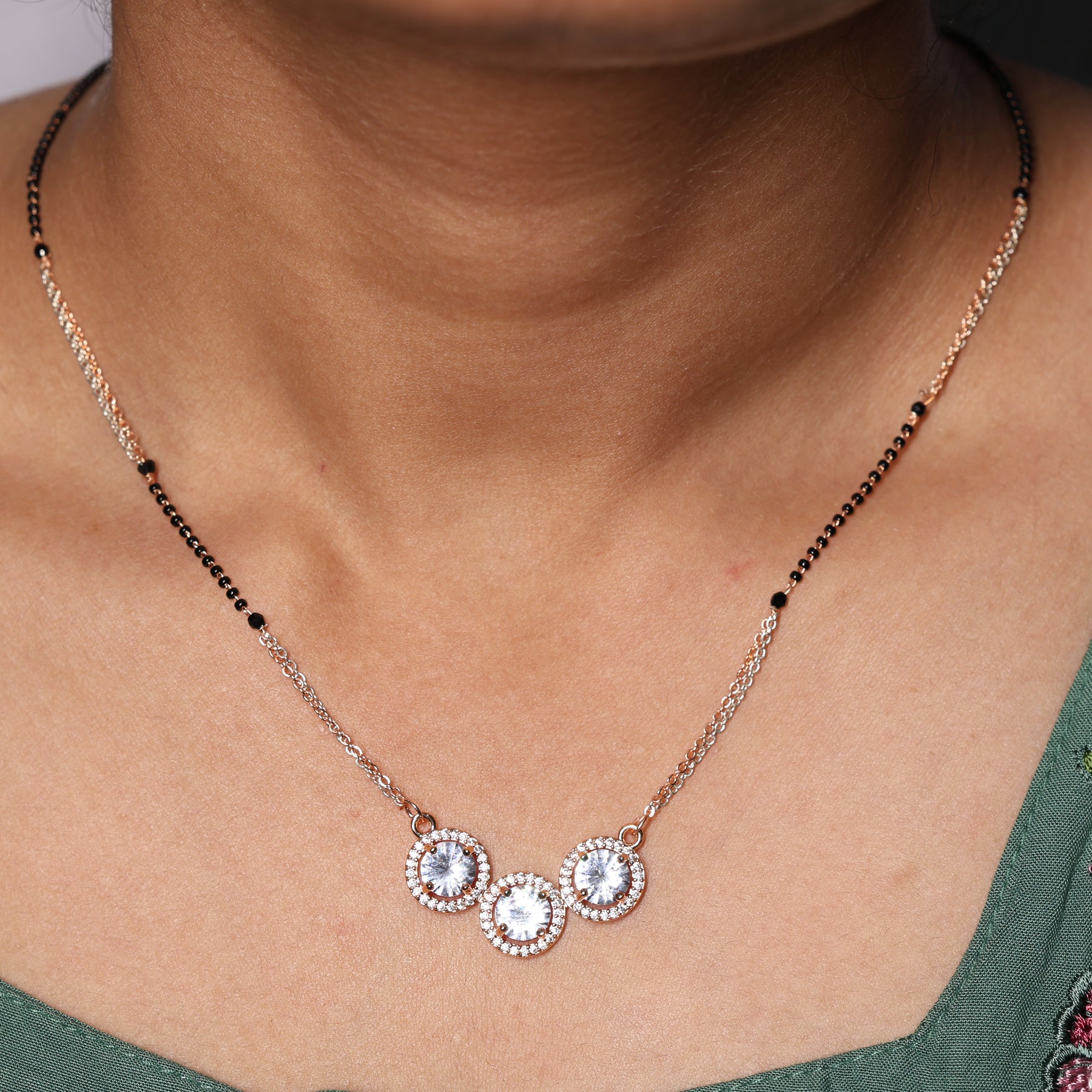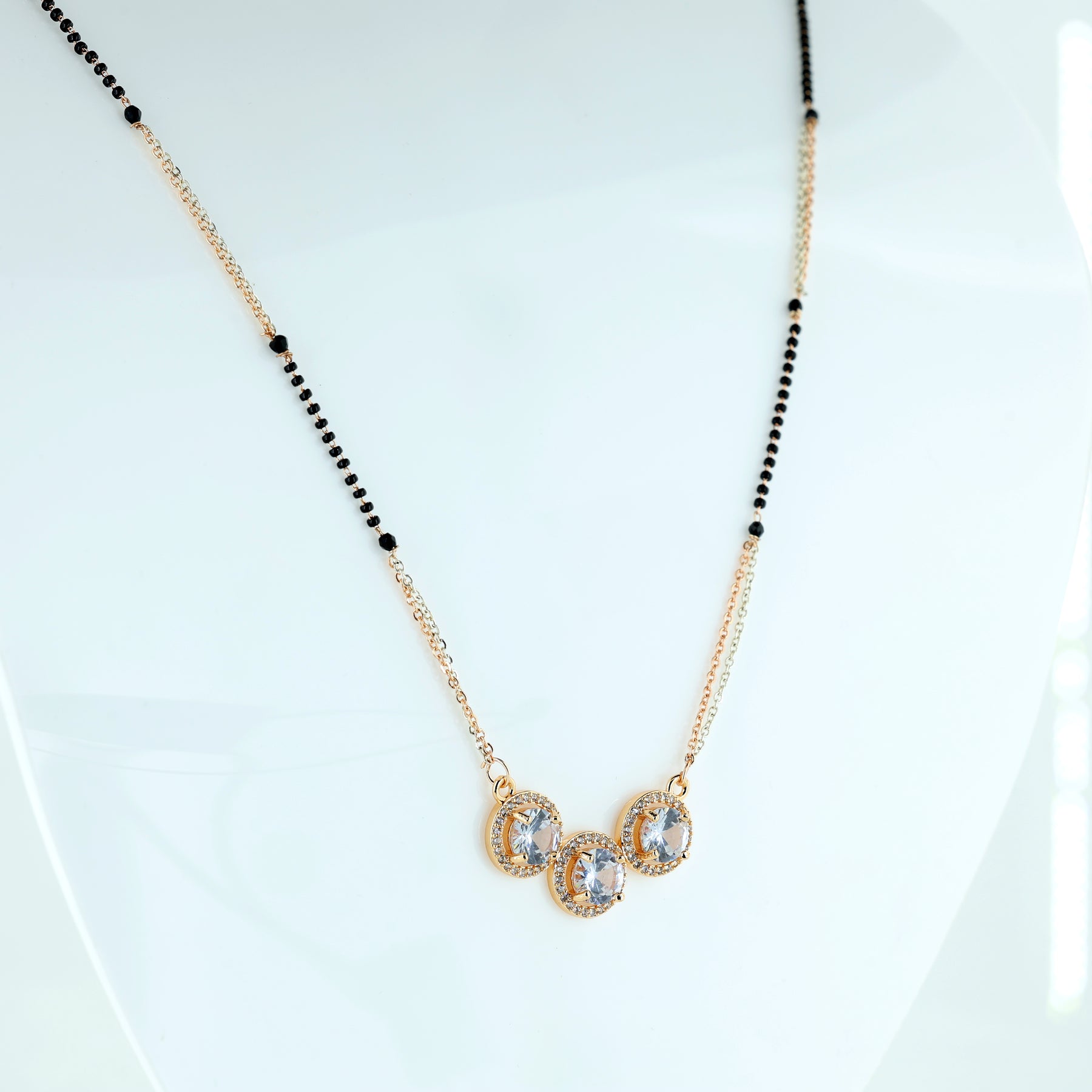This stunning Mangalsutra offers a luxurious take on a timeless tradition, featuring three brilliant solitaire-style crystals arranged in a graceful cluster. Each central stone is encircled by a delicate halo of micro-shimmering accents, creating a high-impact sparkle that mimics fine diamond jewelry. The piece is set on a unique dual-toned chain of gold and silver hues, beautifully integrated with the classic black protective beads. With its radiant gold-toned finish and chic, circular motifs, this Mangalsutra is the perfect blend of bridal heritage and modern glamour.