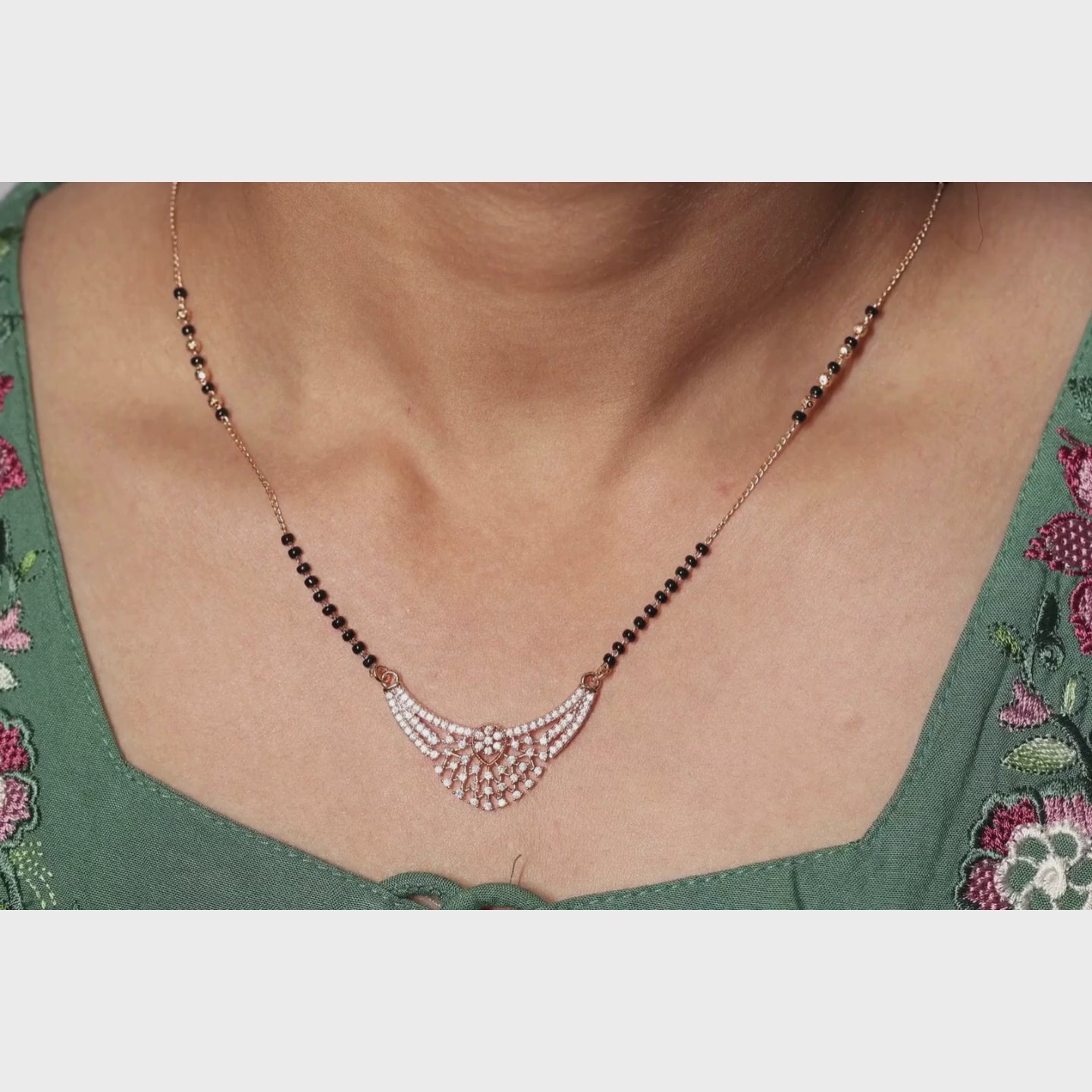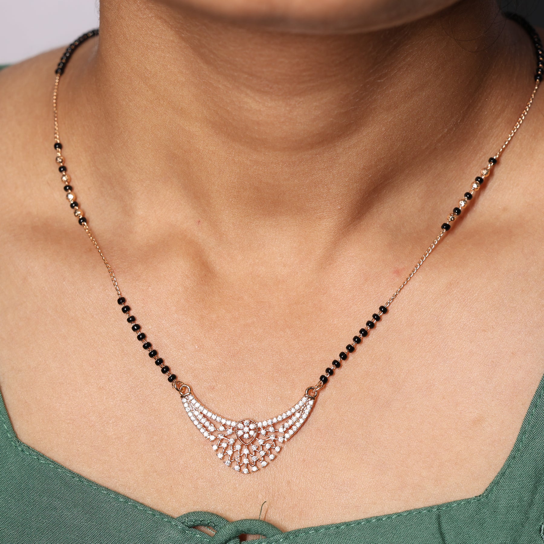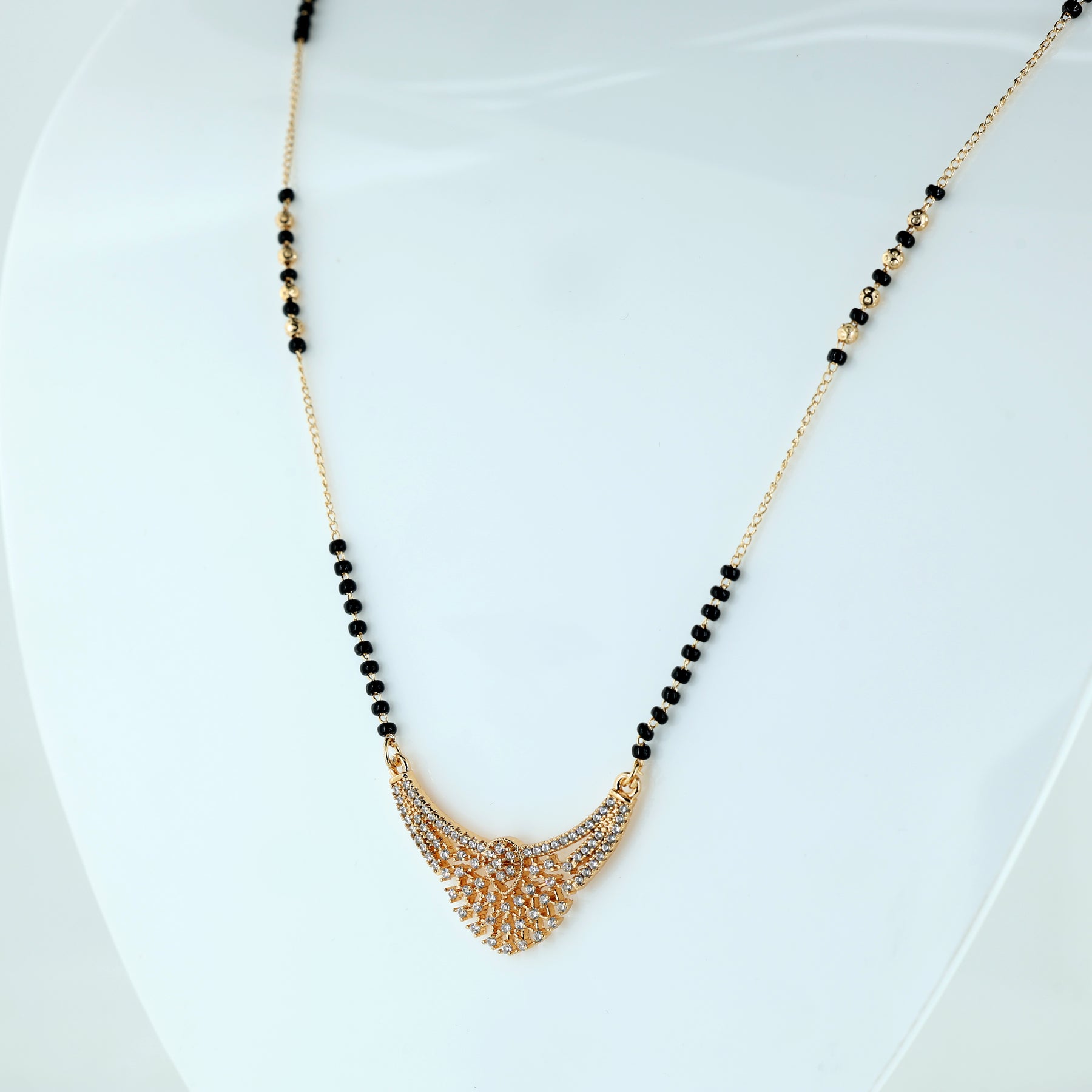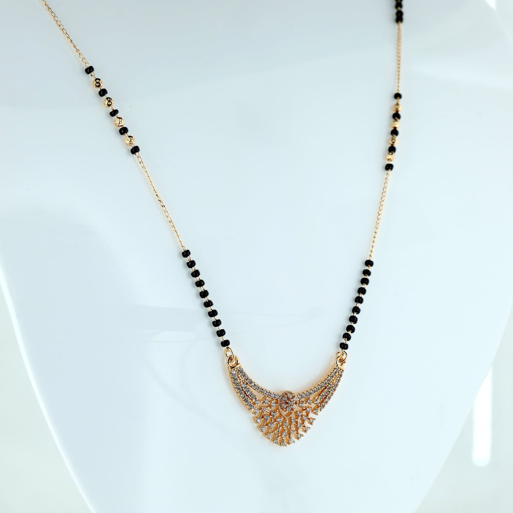 This exquisite Mangalsutra features a stunning, wide-arched pendant that blends traditional geometry with modern brilliance. The focal point is an intricate lattice-style fan motif, densely pave-set with shimmering white crystals that create a high-impact, diamond-like glow. A graceful, sweeping silhouette featuring a detailed open-work pattern that tapers into a sophisticated point at the base.