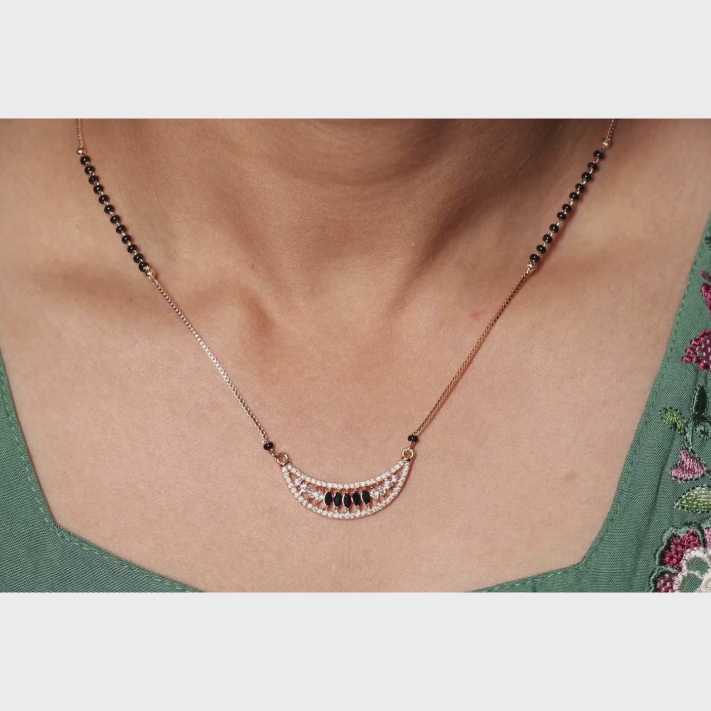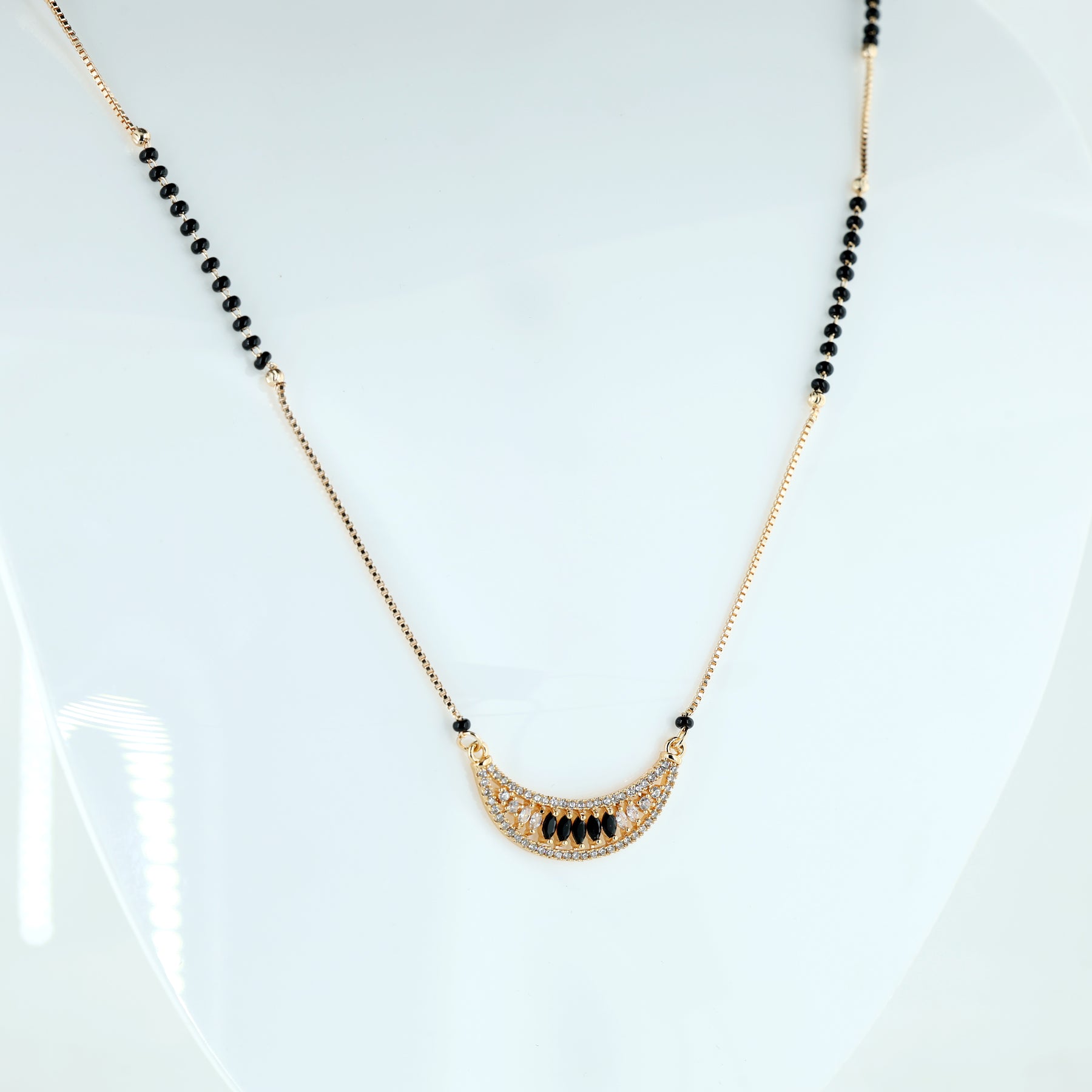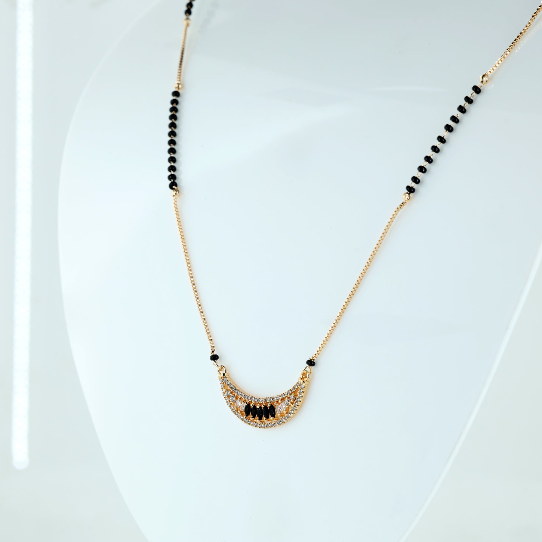 This bold and distinctive design features a classic crescent-shaped pendant set with a row of shimmering white crystals. At its center, it is accented with striking black marquise-cut stones, creating a sophisticated "midnight" aesthetic that mirrors the traditional black beads. The piece is finished with a delicate gold-toned chain featuring black protective beads and gold accents, offering a perfect blend of high-contrast glamour and cultural heritage.