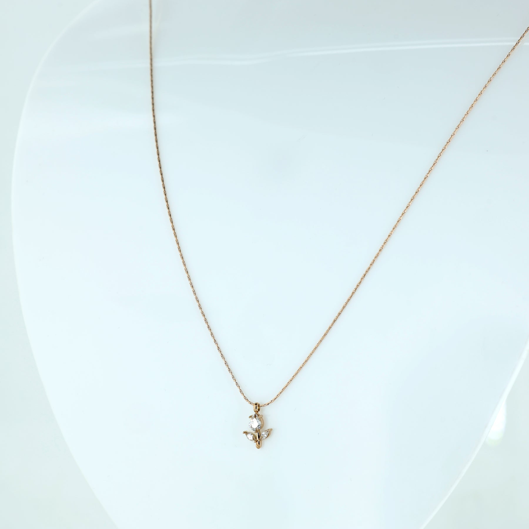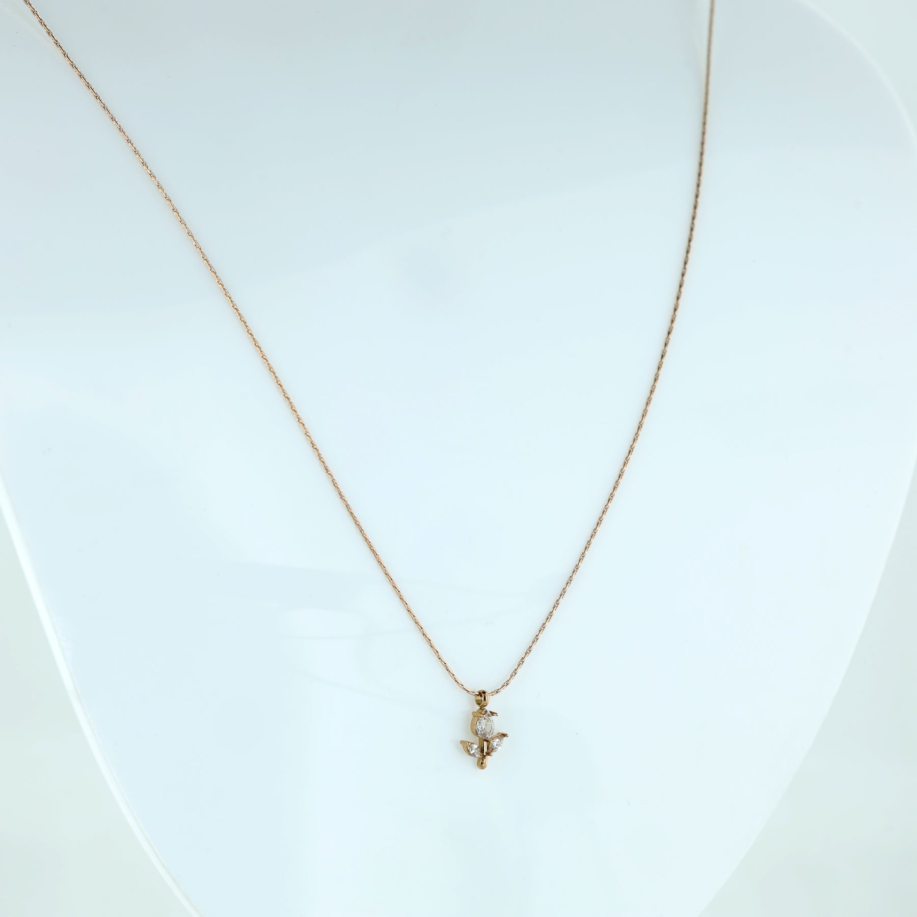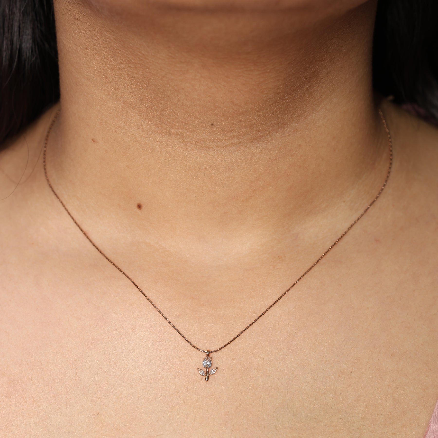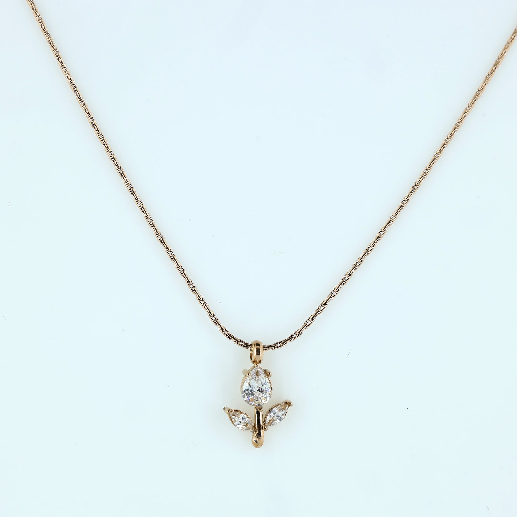Celebrate the beauty of nature with this exquisite Tulip Bloom Pendant Necklace. Designed to mimic the soft opening of a flower bud, this pendant combines geometric precision with organic grace, making it a timeless addition to any jewelry collection. A brilliant pear-cut crystal serves as the primary bud, radiating light from every angle. Set in a warm rose gold-toned frame with a vertical "stem" detail that adds a unique architectural touch.