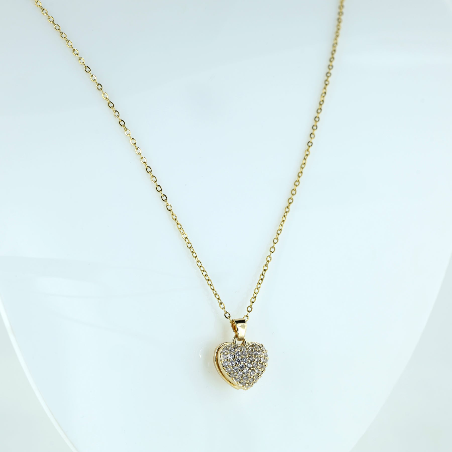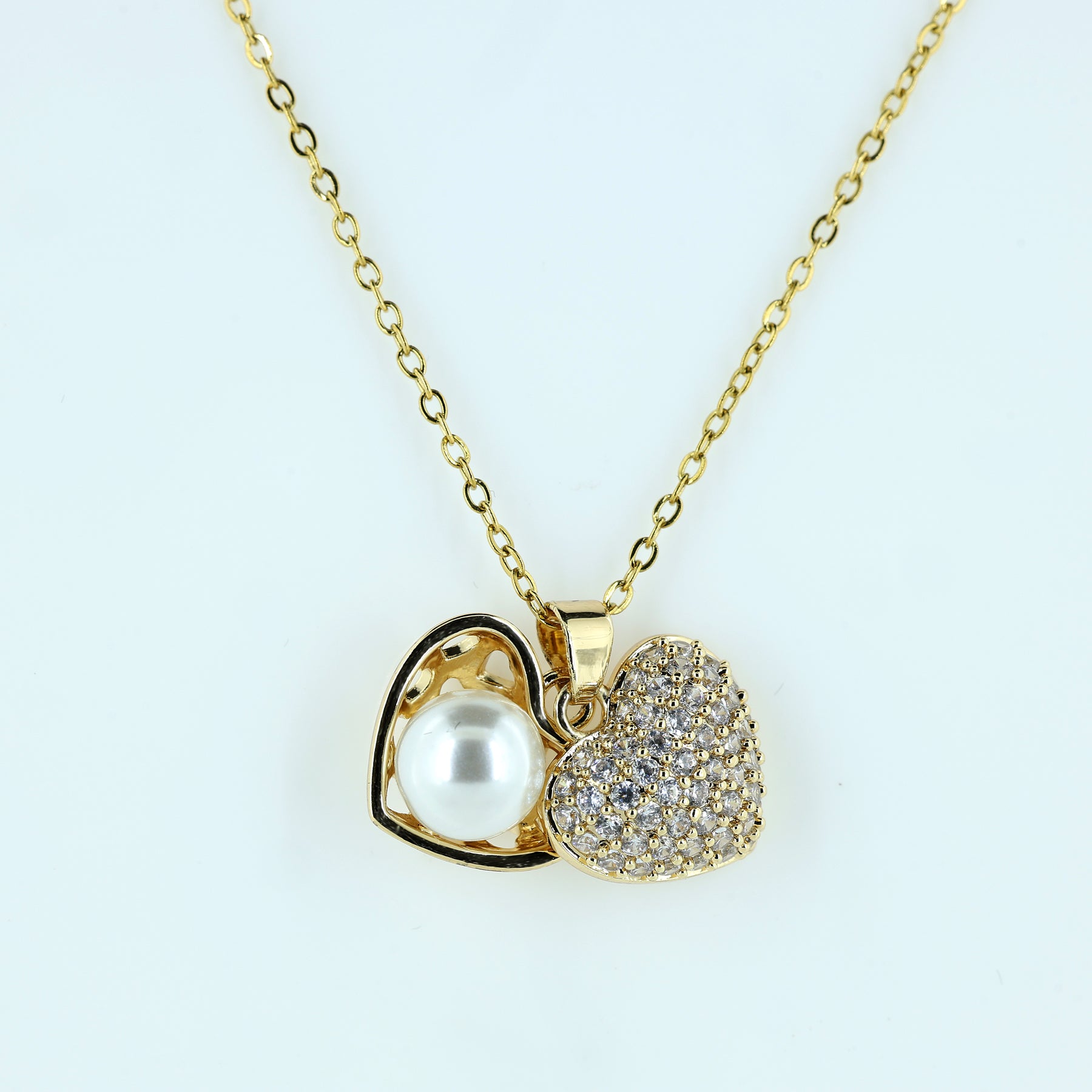 Celebrate love with this stunning dual heart pendant featuring a luminous pearl and sparkling crystals. Designed with a sleek gold plated chain, it adds timeless charm and graceful shine to both everyday and special outfits. Perfect for daily styling, date nights, or gifting, this necklace effortlessly elevates any look with its timeless sparkle and feminine charm.