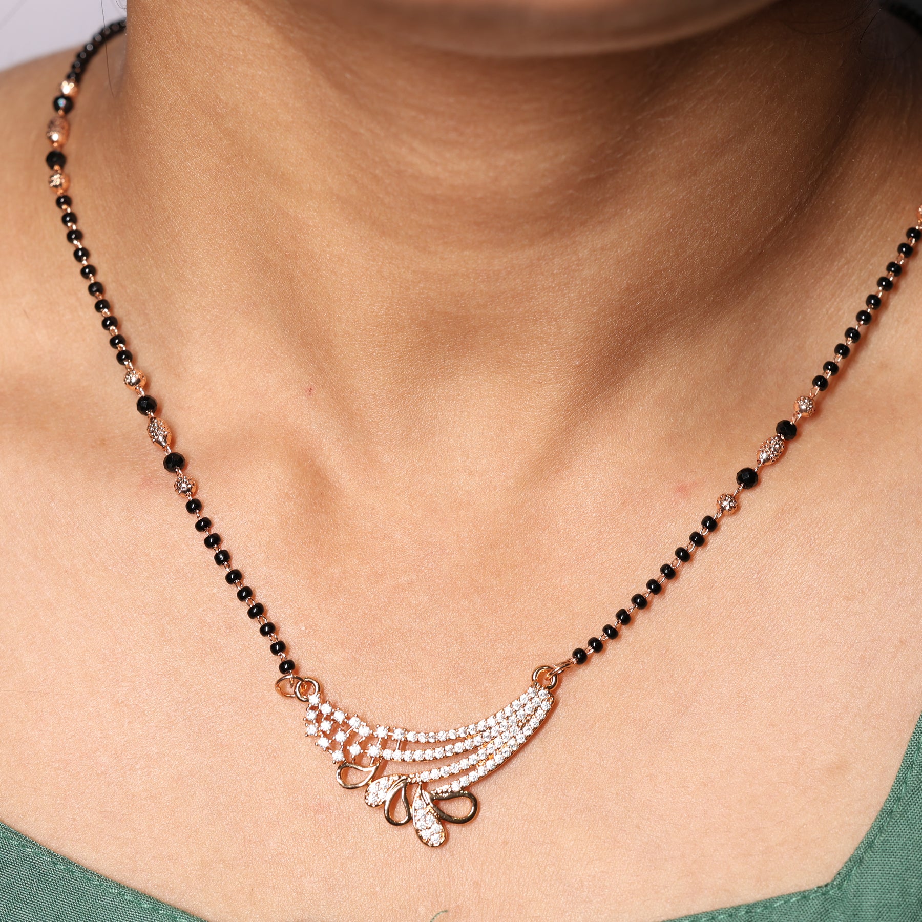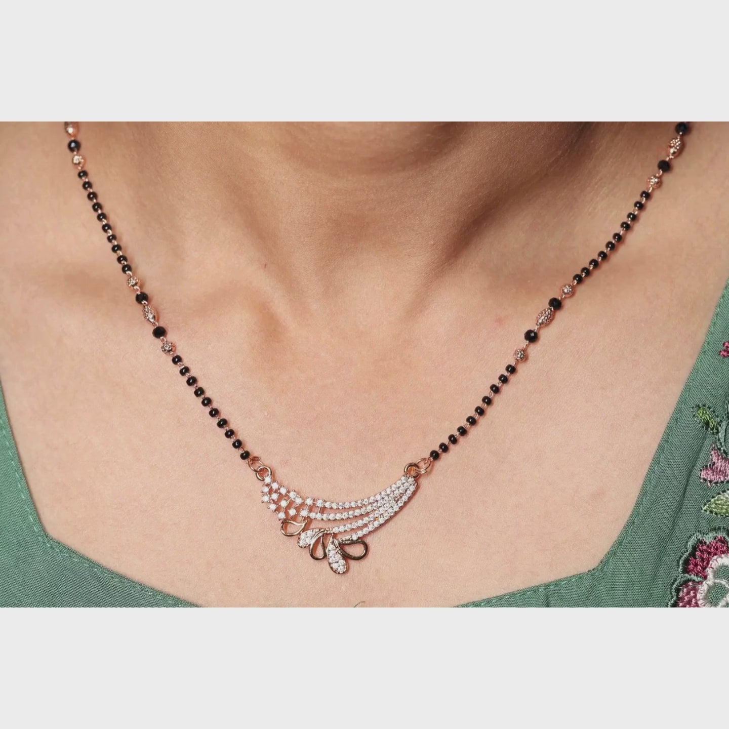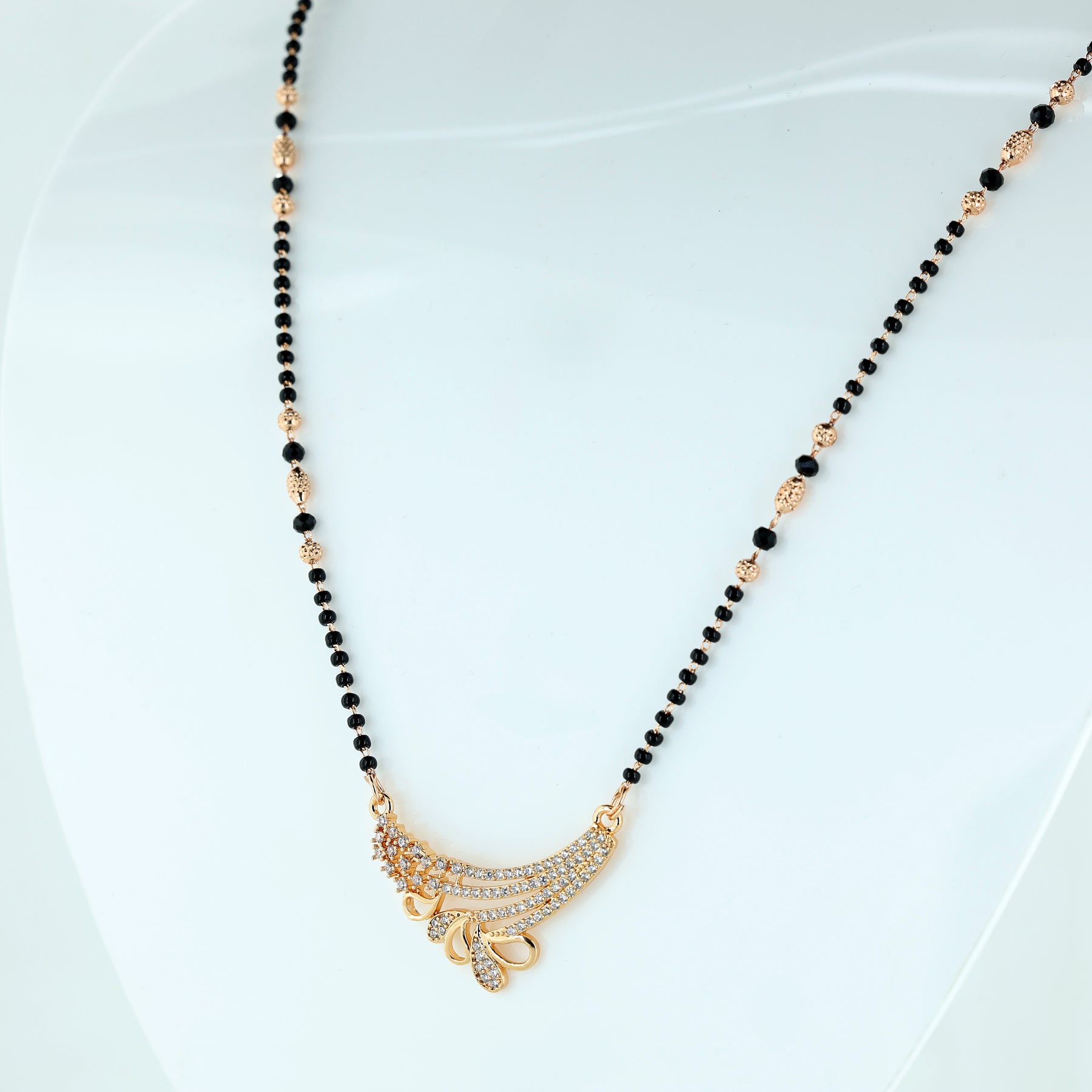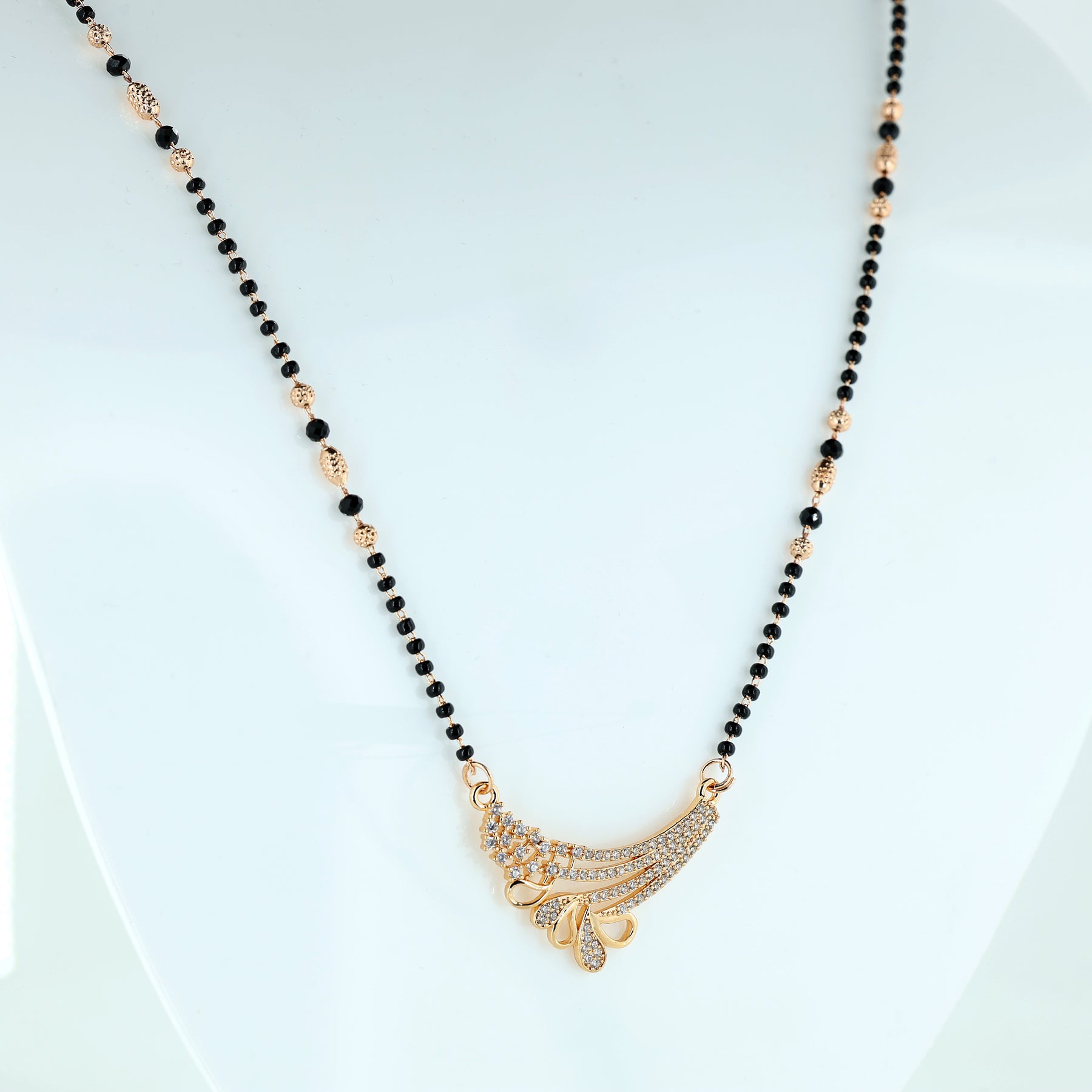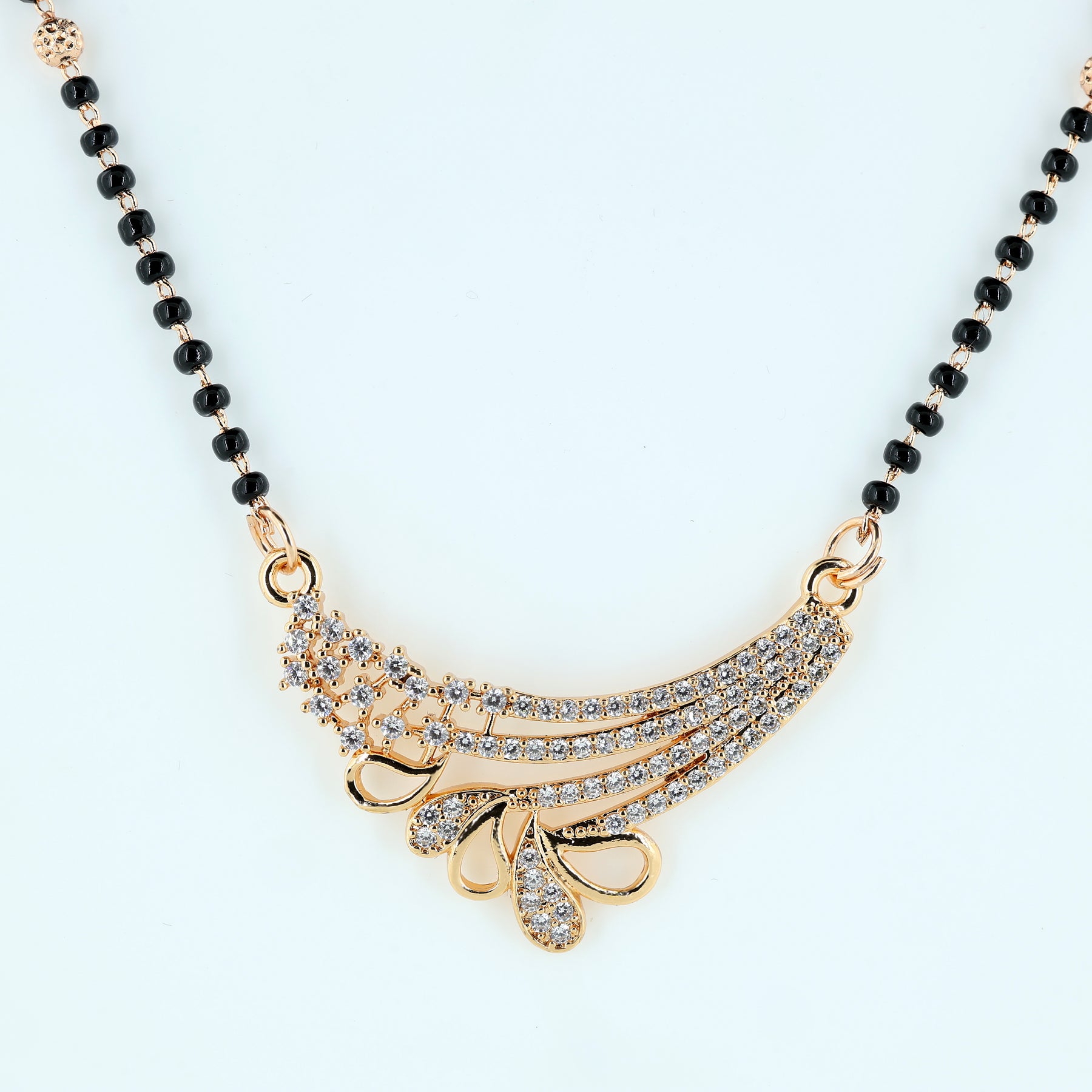 Celebrate Tradition with a Modern Glow Elevate your everyday style with this exquisite Mangalsutra, designed for the modern woman who appreciates her roots. This piece seamlessly blends the sacred tradition of black beads with a sophisticated, contemporary pendant design, making it the perfect accessory for both professional attire and festive celebrations. Features a sweeping, wave-inspired pendant adorned with high-quality, brilliant-cut stones that capture the light from every angle.
