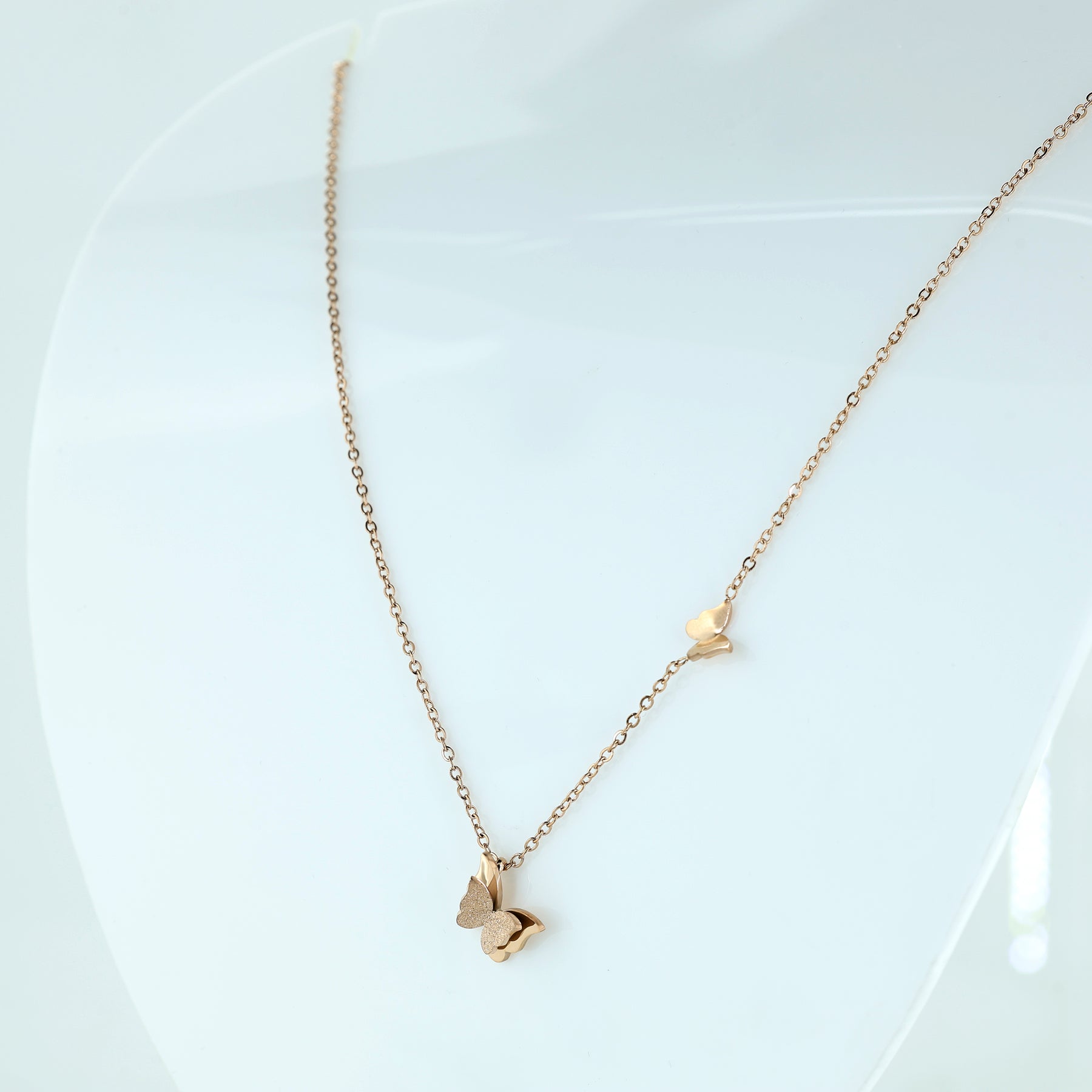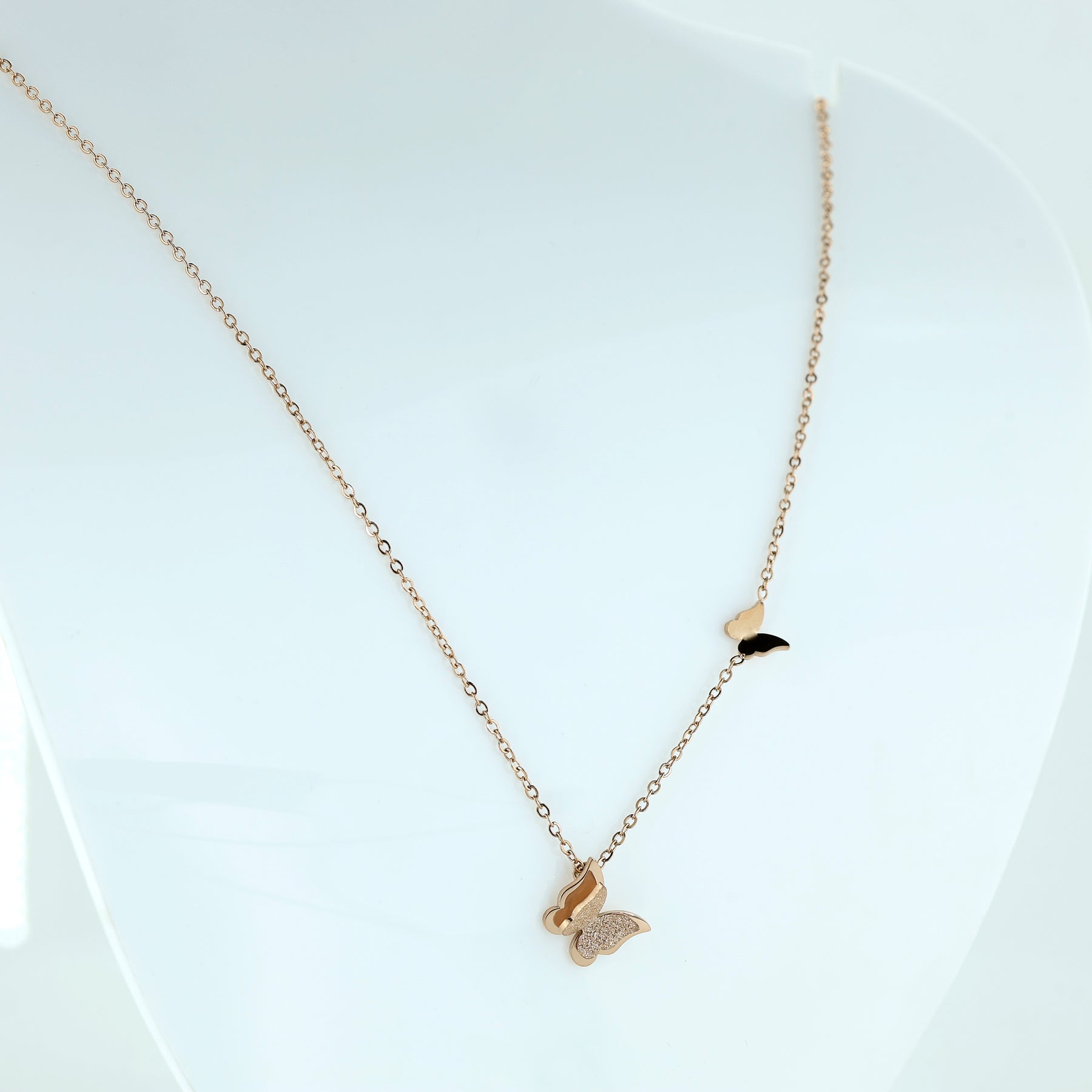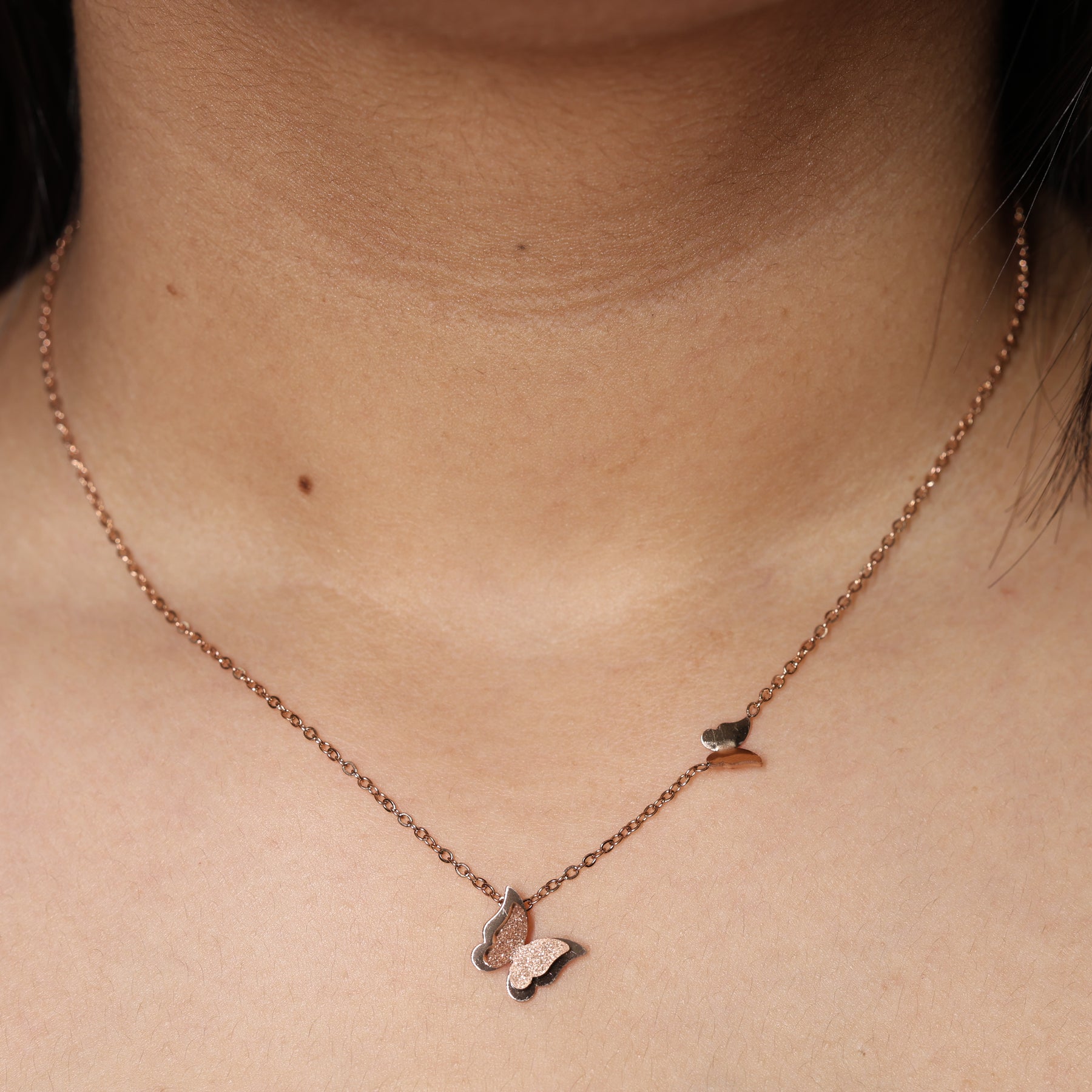 This elegant necklace features a minimalist aesthetic crafted in a warm rose gold finish.A 3D-effect butterfly serves as the focal point. It features a layered wing design, with one wing finished in a sparkling frosted texture that catches the light, while the other remains polished and smooth. A smaller, sleek polished butterfly is fixed higher up on the side of the chain, adding a playful sense of movement as if it’s in flight. The pendant hangs from a fine cable chain, making it a perfect dainty accessory for daily wear or layered styling.