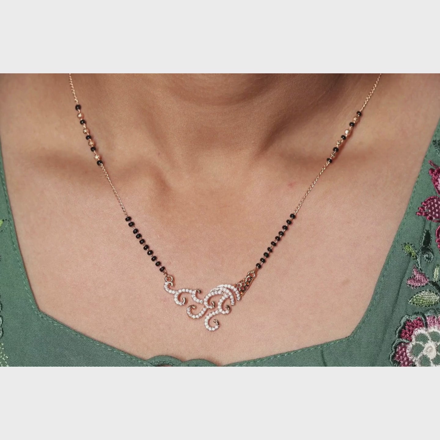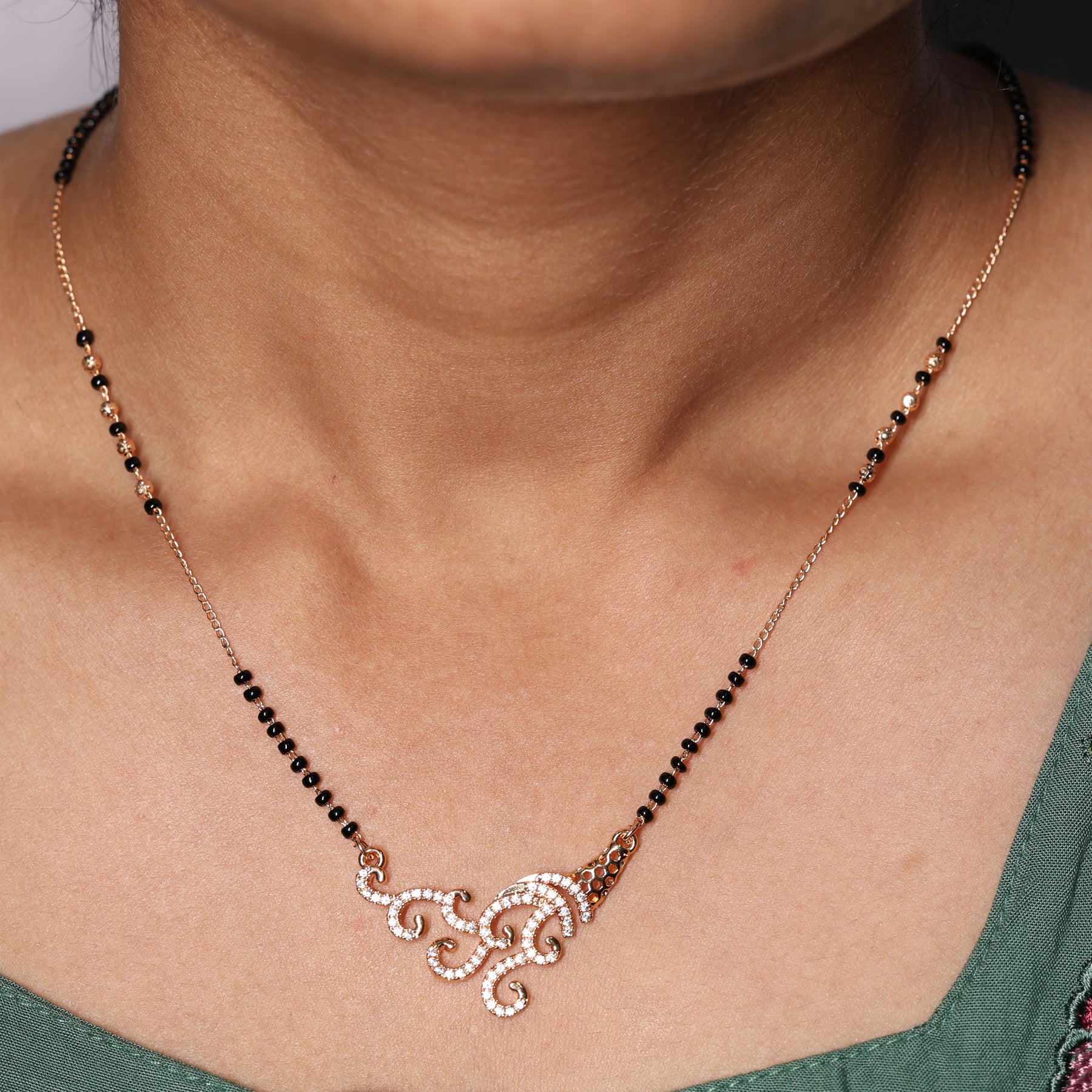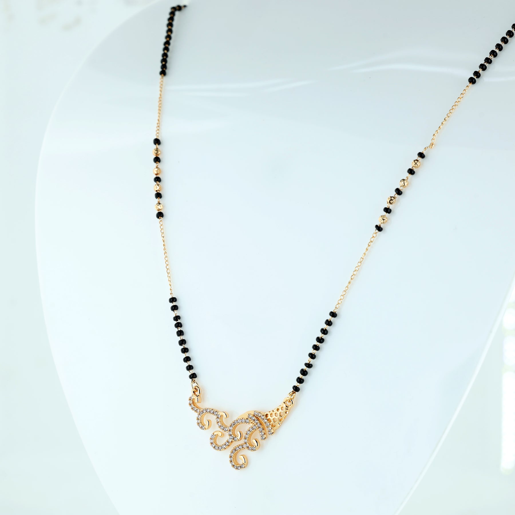 Celebrate tradition with a touch of modern sophistication with this Elegant Crystal Swirl Mangalsutra. Featuring a beautifully crafted pendant with intricate swirl detailing, the design is enhanced with sparkling crystals that catch the light from every angle. The classic black bead chain symbolizes love and protection, while the stylish gold-toned finish adds a luxurious appeal. Perfect for daily wear or special occasions, this mangalsutra effortlessly complements both ethnic and contemporary outfits, making it a timeless addition to your jewellery collection.