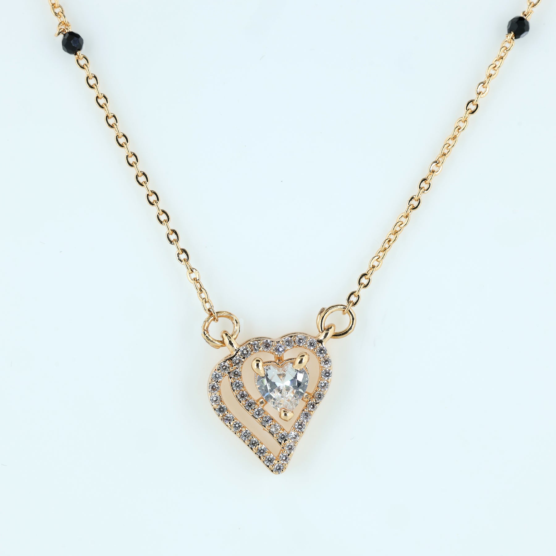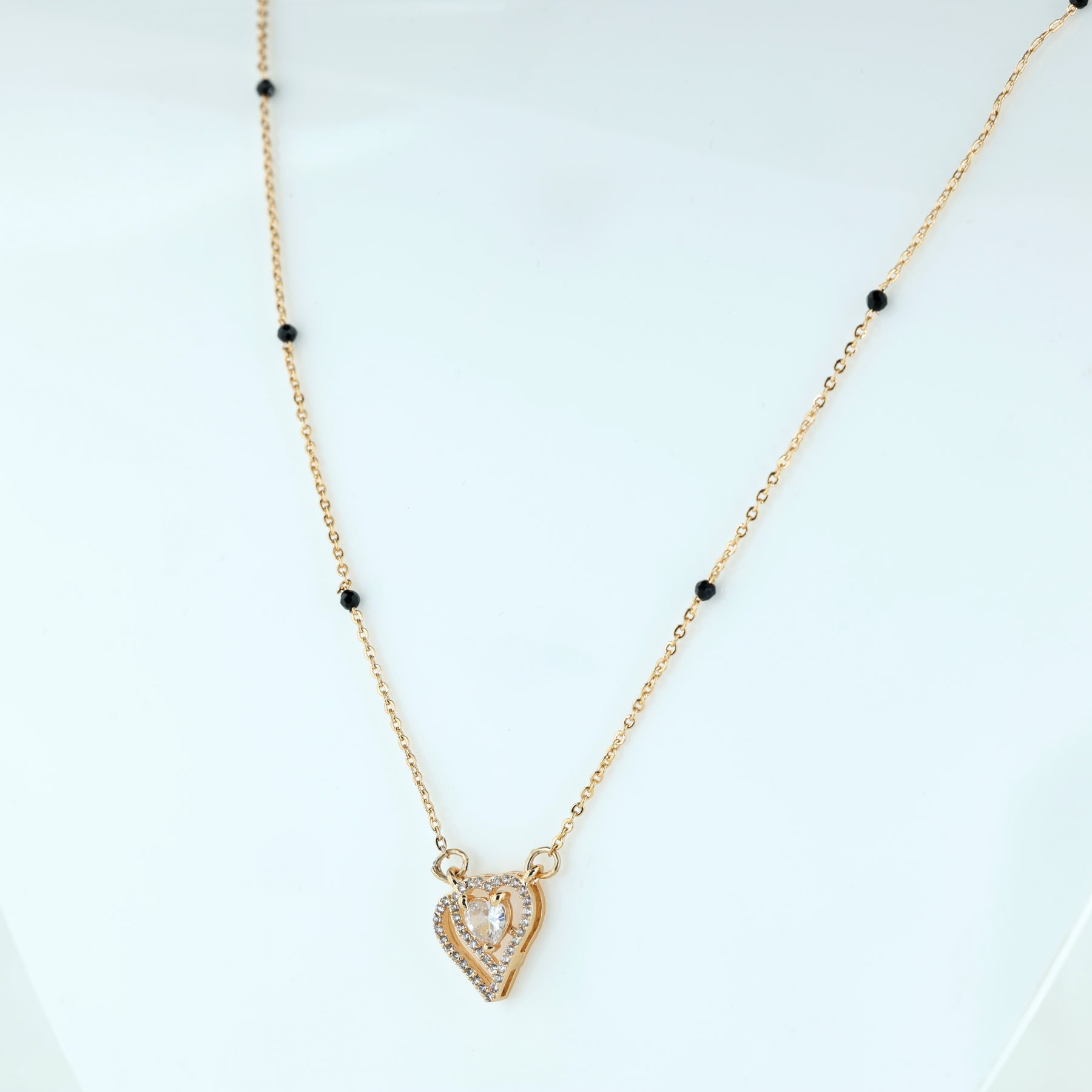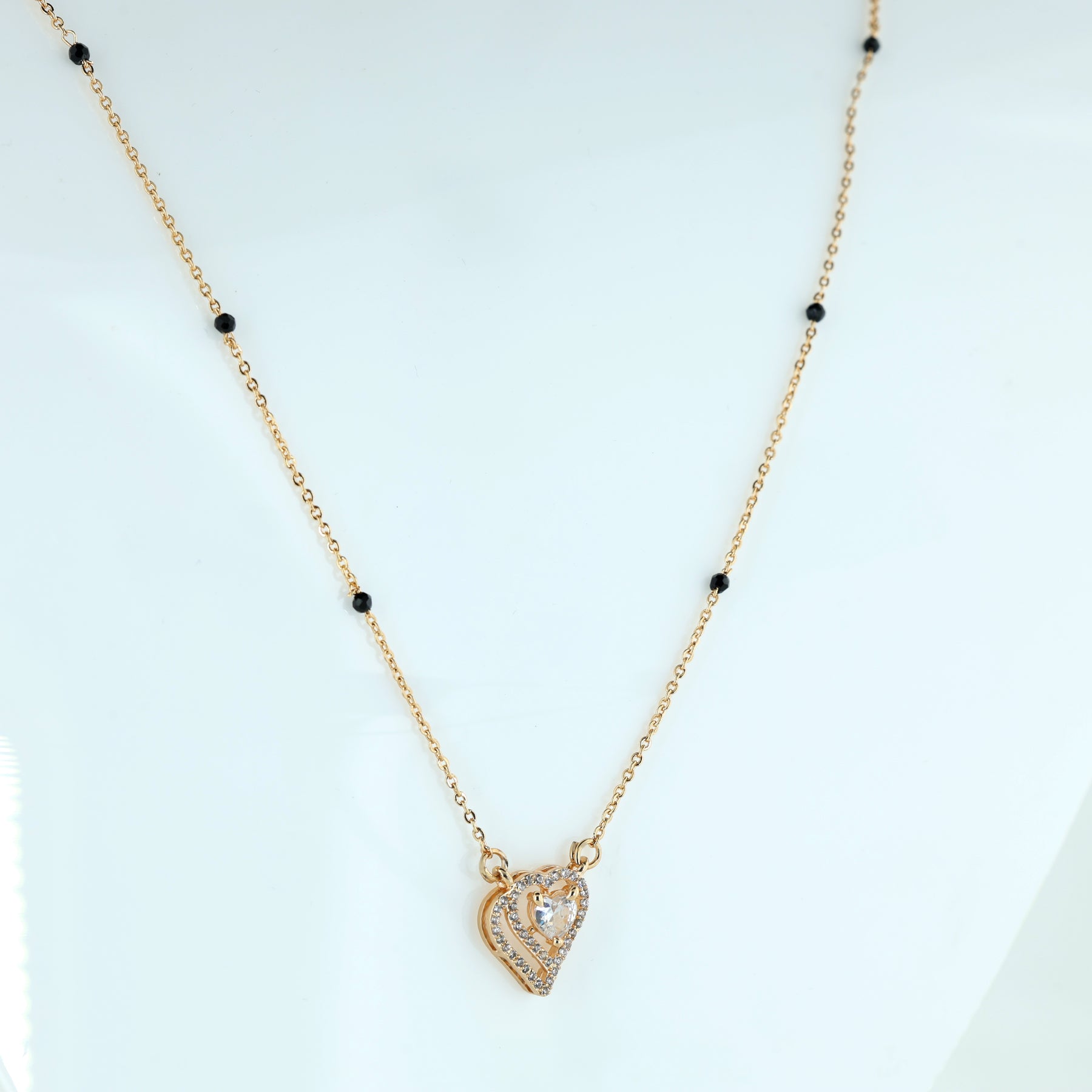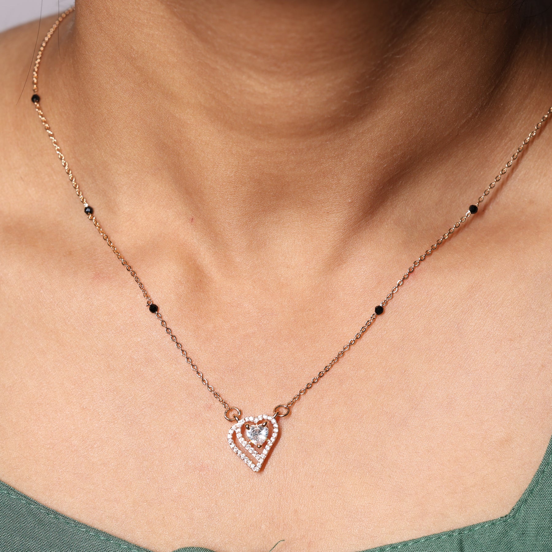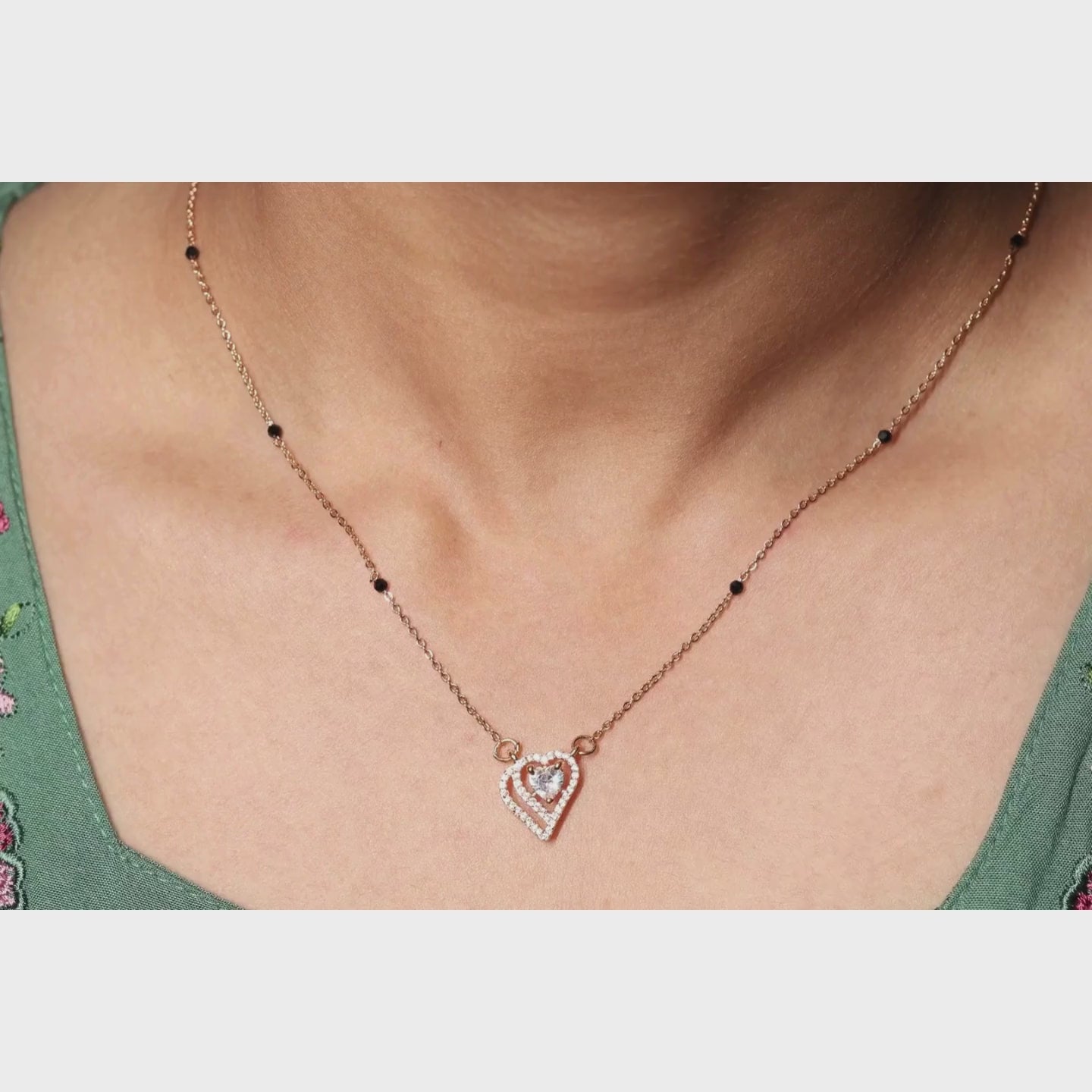 A Timeless Emblem of Love and Commitment Celebrate your bond with this exquisitely crafted Heart-in-Heart Mangalsutra. Featuring a unique double-layered heart pendant, this piece showcases a brilliant solitaire-style crystal nestled within a shimmering halo. Designed for the woman who prefers delicate, high-shine jewelry, it offers a sophisticated way to wear a sacred tradition every day.